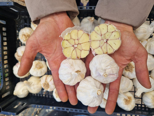 El ajo morado, conocido por su intensidad de sabor y sus múltiples beneficios, es cosechado en su punto óptimo de madurez para garantizar un producto fresco, natural y sin conservantes.