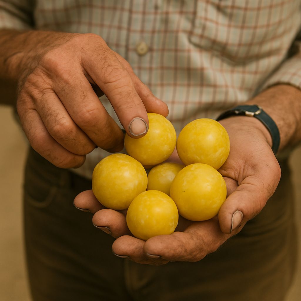 El resultado: frutos dulces, jugosos y llenos de carácter, con ese sabor auténtico que solo se consigue cuando se respeta la tierra. Recolectadas a mano y directas desde su finca, estas ciruelas amarillas son un pedacito de verano en cada bocado.